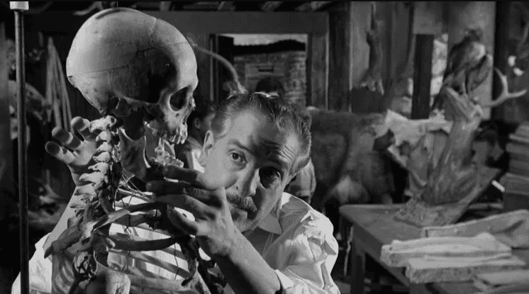 Seremos muy felices celebrando la actuación sumamente fuerte de Arturo de Córdova, quien nos habla con tanta ternura del esqueleto que adorna el sótano muy gótico de su casa.