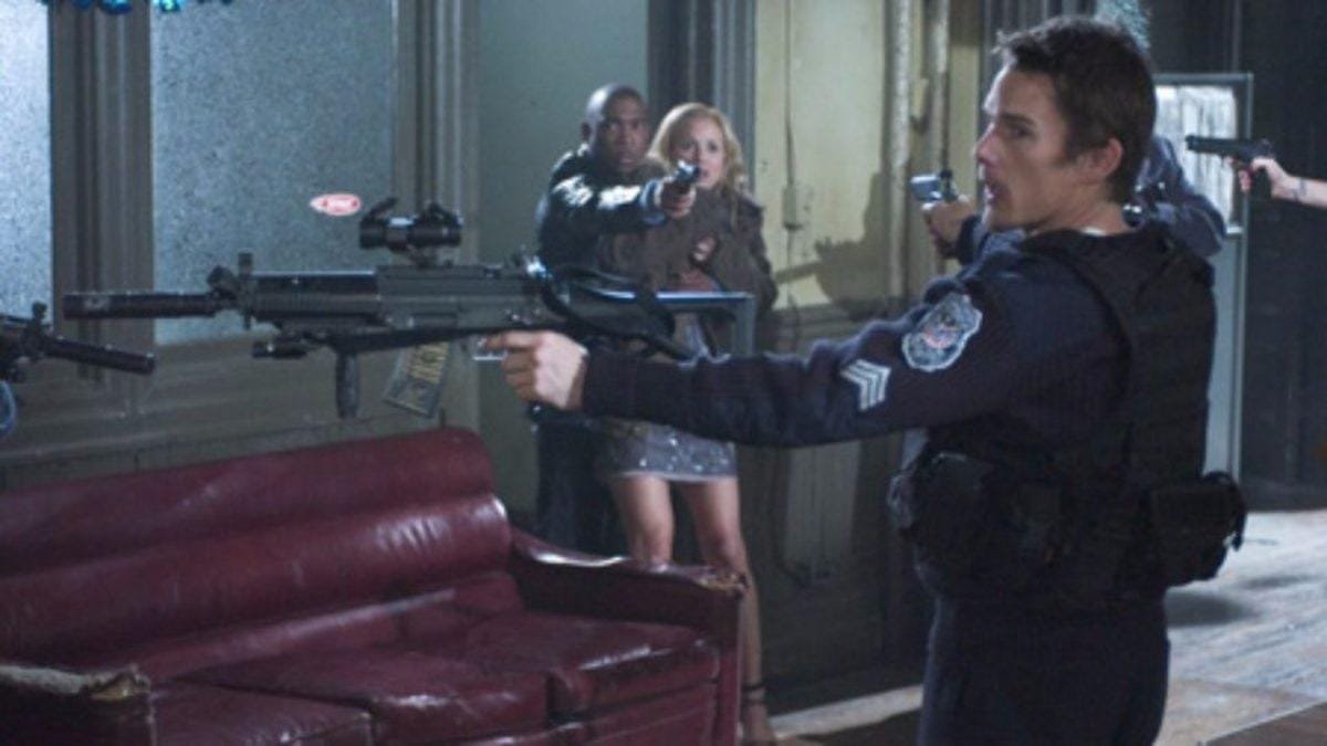 El guionista James de Monaco ha hecho un buen trabajo de cirujano, pues ha extirpado la médula del relato original, la ha trasladado con higiene y la ha injertado en medio de otro organismo vivo. Las costuras se notan poco, de suerte que este Assault on Precinct 13 posee arterias propias que hacen funcionar su metabolismo, con base en un héroe atormentado, el oficial Jake Roenick (Hawke), movido por una crisis de culpa (fundada con corrección en el preámbulo del filme). Otro de los personajes, el delincuente que encarna Fishburne, es un hombre que, a pesar de su condición, posee un código de honor que lo establece como una especie de redentor del oficial Roenick.