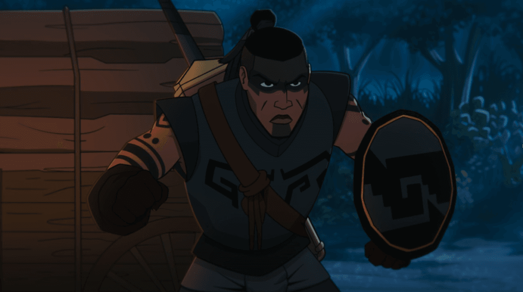 LOS PERSONAJES: Al igual que la trama, la película tiene un problema grave con los personajes: son muchos y poco desarrollados. Gran parte del elenco es tan básico que se siente como si los hubieran metido por obligación al ser una historia de Batman. Por ejemplo, Acatzin, el fiel sirviente de Coatl, que le enseña a pelear, pudo haber sido reemplazado por cualquier personaje inventado (digamos, algún guerrero azteca de élite) y poco o nada cambiaría la trama. Se supone que Acatzin y Coatl tiene una relación de hace muchos años; se asume que es alguien que el jefe Toltecatzin y su familia aprecian mucho, pero las escenas entre el protagonista y su mentor no transmiten esa relación. Hay pocos momentos en que realmente tengan una conversación personal entre ellos. Encima de todo, esos diálogos sobre respetar a Tzinacán y confiar en su ayuda, ya lo hacía el jefe Toltecatzin, haciendo que el papel de Acatzin se sienta redundante. Entonces ¿Por qué está en la película? Porque necesitaban un Alfred. Pero si se pone atención a las historias de Batman, Alfred es más que su mayordomo, es la figura paterna que lo cuida, guía y aconseja, además que su personalidad no se reduce a su relación con Batman. Alfred tiene su propia historia (era un espía británico, médico militar y actor) y sus propias relaciones personales, entre otros elementos.