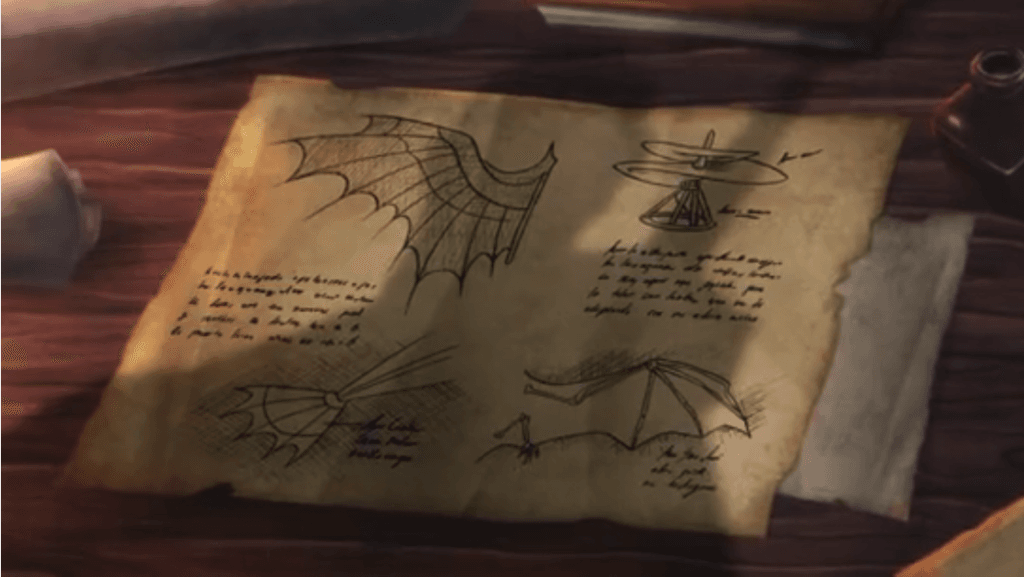 Un personaje que sí está bien manejado es el propio Batman. Primero que nada, siguen los pasos importantes del mito del personaje. Al ver morir a sus padres, se siente perdido y hambriento de venganza. Preguntándose qué hacer, un murciélago (en este caso un dios murciélago) se la aparece y lo inspira. También, como mencioné en el apartado anterior, lo vemos entrenar, crear su armadura y equipo (batarangs, bombas de humo, capa para planear, entre otros) e irlos mejorando dependiendo de las necesidades que va encontrando con cada batalla que tiene. Hay cosas que omiten, como la regla de no matar, pero siendo un azteca sería ridículo que hayan intentado mantener dicha regla. Una de las partes que, como fan de toda la vida del personaje, más disfruté es el guiño a la inspiración de Bob Kane para crear su diseño. En una escena, mientras Batman revisa algunos papeles de los españoles, se topa con copias de unos diseños de Leonardo DaVinci. Uno de estos diseños es el de su famosa máquina voladora que tenía la anotación “Tu máquina no debe tener otras alas más que las de un murciélago” (fig. 2), inspirando a Coatl a crear su capa. En varias entrevistas, Bob Kane declaró que parte de la inspiración de Batman le llegó cuando hojeaba un libro sobre inventos y vio esa misma máquina voladora con esa misma inscripción.