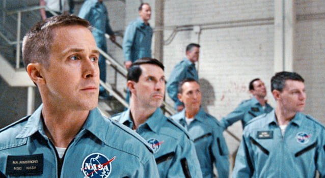 Basada en la biografía de Neil Armstrong (1930-2012) escrita por James R. Hansen, la cinta deja clara sus regalas desde la primera secuencia en la que la cámara, constreñida por el armatoste de un avión, nos sitúa en la incómoda posición de un Neil (Ryan Gosling) azotado por turbulencias. Lo de afuera parece no interesar mucho, sólo importa la conmoción inmediata que amenaza al protagonista.