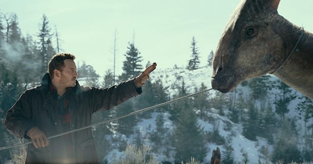 Mientras, Claire y Owen van en busca de Maisie con la ayuda de la mercenaria experta en aeronaves Kayla Watts (DeWanda Wise). Los tres llegan accidentadamente a la sede de “Byosin”, que está rodeada de bosques llenos de dinosaurios terroríficos, y comienzan la aventura con la ayuda de los otros tres personajes clásicos, los de Neill, Dern y Goldblum que ya han encontrado a Maisie. Cuando se conocen, es un momento emocionante sin duda.