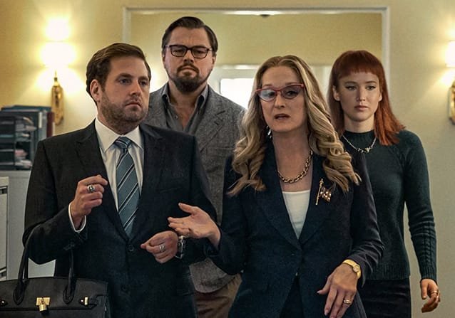 Pero la gran baza de McKay no es solo el divertido guion que da en el clavo con todos los personajes que componen nuestra actualidad, es un elenco insuperable, liderado por una Meryl Streep que no deja nunca de sorprender por mucho que pasen los años. Es tan real y tan humana esa presidenta llena de arrogancia y estupidez que es indudable que si existiera, sería la presidenta del país. Hay también un Mark Rylance como representante de Silicon Valley, caricatura de un Steve Jobs como símbolo de extrema inteligencia, que murió por pensar que su cáncer se podía curar con naturoterapia, a medias con un Elon Musk que ya en sí mismo es una caricatura. O un Leonardo DiCaprio como el Dr. Mindy, el científico que en el siglo anterior salvaría la humanidad y que ahora tiene un precio, el que más ha dolido al sector progresista. Pero es que nuestra realidad es así, lo otro eran arquetipos.