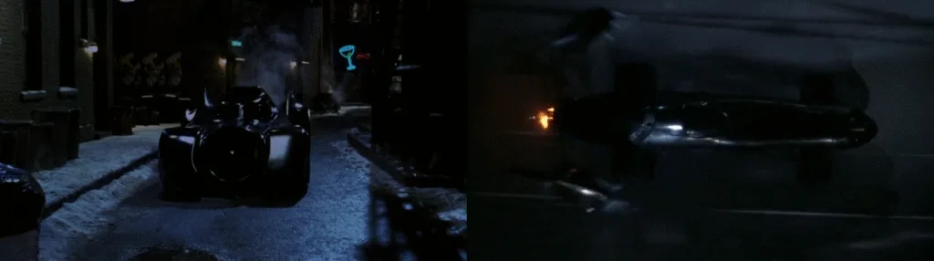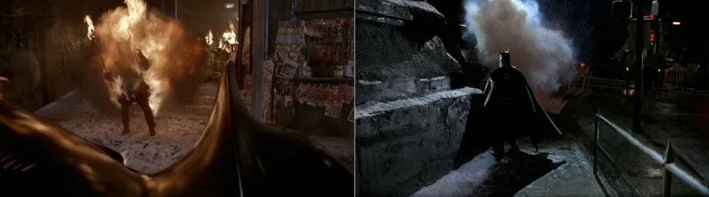 En la secuela, hay varias escenas con ese nivel de violencia, pero no muestran el destino de quienes la sufren (Figura 5) o bien ocultan el acto violento en sí (Figura 6). Según la MPAA, mientras se minimice el impacto de la violencia, la película no corre el riesgo de obtener una clasificación R (o clasificación C en México).[16] Dado que ambas películas son de superhéroes, la gente esperaba acción y algún tipo de violencia. En el sentido de “acción superheroica”, ni Batman ni Batman Regresa fueron demasiado lejos. Entonces, ¿de dónde proviene el conflicto entre Batman Regresa y el “concepto elevado” y la “sinergia”? De eso hablaré a continuación.