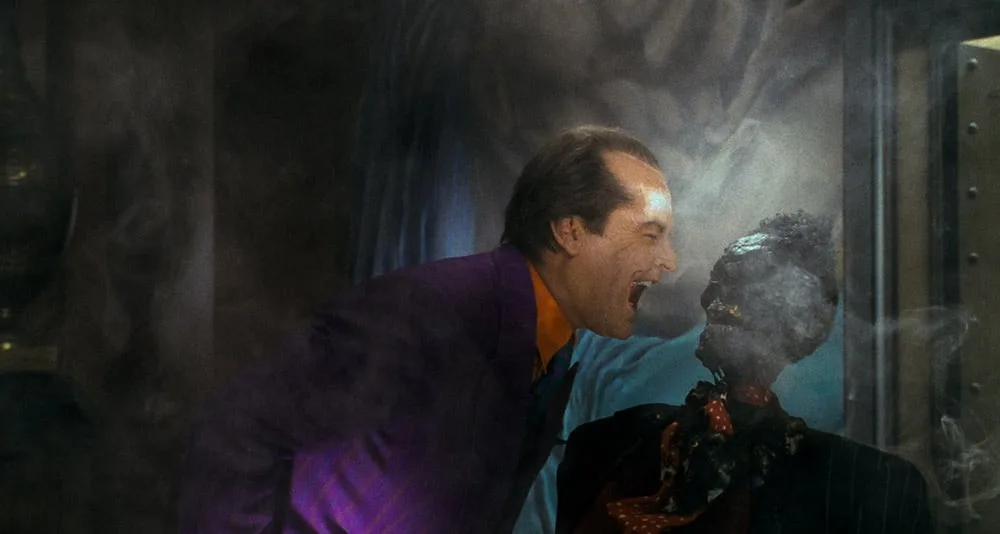Figura 4 El Guasón de Jack Nicholson se ríe de los restos fritos de una de sus víctimas, lo que produce un marcado contraste entre terror y humor.