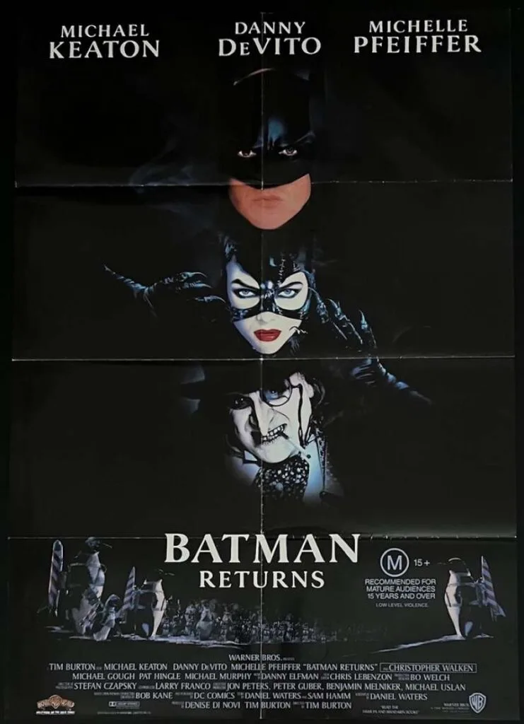 Al igual que su predecesora, Batman Regresa se planteó como una producción de alto concepto con una gran campaña de sinergia. En primer lugar, la publicidad del regreso de Michael Keaton en el papel titular y de las nuevas incorporaciones Michelle Pfeiffer y Danny DeVito (Figura 2); la promesa de más acción (con el tráiler centrado en explosiones y escenas de acción, haciendo que la película parezca más un espectáculo visual que un thriller psicológico);[13] y el hecho de que fuera la secuela de una película muy exitosa que desencadenó un fenómeno es otro elemento importante del alto concepto. En cuanto a la sinergia, esta vez Prince no regresó (ya que esa fue una de las imposiciones del estudio en la película original de 1989 que Burton nunca aceptó), pero la mercadotecnia y el marketing exploraron otras opciones: McDonald’s, un Golden Book, una línea de juguetes de Kenner, incluso un dispensador de dulces, por nombrar algunos. Sin embargo, cuando se estrenó la película, la reacción no estuvo a la altura de los estándares del estudio.
