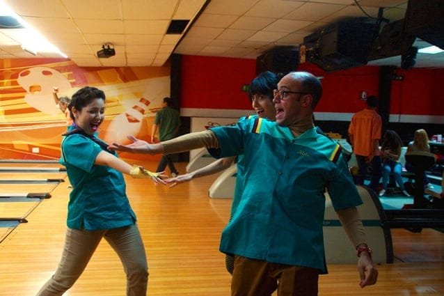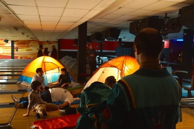 La familia acampa en el boliche.