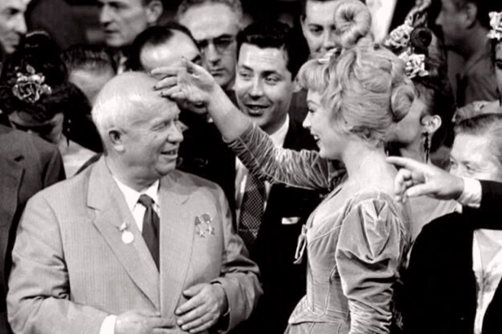 Durante la comida, Nina, la esposa de Kruschev, sentada a un lado de Frank Sinatra, externó su deseo de conocer Disneylandia, petición que fue transmitida de inmediato a las autoridades, que se negaron a complacer su petición por temor a un atentado. En cambio, después del almuerzo, los invitados fueron llevados a presenciar el rodaje de una escena de la película Can-Can, protagonizada por Frank Sinatra y Shirley MacLaine, El fragmento elegido era una interpretación de ese número de baile, con levantamiento de faldas y un final pícaro: uno de los bailarines se deslizaba bajo la falda de una chica y emergía de ahí sosteniendo una prenda íntima, ante el sonrojo de la concurrencia. Los periodistas preguntaron al líder soviético qué pensaba sobre tales escenas. Opinó que “siempre es mejor ver una cara linda que un culo”.