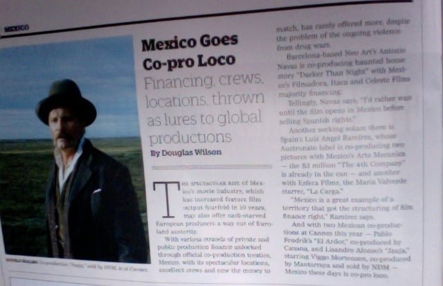 La revista Variety, uno de los órganos nucleares de información en los pasillos de Cannes, se hace eco hoy de esta tendencia con un texto firmado por Douglas Wilson, titulado “Mexico Goes Co-pro Loco: Financing, crews, locations, thrown as lures to global productions” (“Mexico se vuelve loco con las coproducciones: financiamiento, técnicos y locaciones, avocados a atraer producciones globales”).