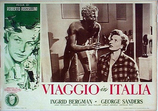 Una pareja inglesa madura, Alexander “Alex” Joyce y Katherine, interpretada por Ingrid Bergman y Georges Sanders, viaja a Italia para intentar vender una villa heredada. Los silencios, los gestos, los actos diarios, los diálogos, sus lánguidos paseos entre las ruinas romanas y sus paisajes, Nápoles, Capri, Pompeya, narran un matrimonio que finaliza. El dolor es evidente, traspasa cada escena, nos abruma, y nos identifica con el agitado mundo interno de los protagonistas, que no quieren incidir sobre su final como esposos. Ella desea perderse en la contemplación de la cultura antigua, visitar museos, caminar entre las ruinas; él prefiere pasar el tiempo con amigos y prostitutas. Los vestigios de la civilización romana funcionan como símbolos de ese matrimonio que termina. Cuando los arqueólogos exponen a un par de víctimas del Vesubio, que se supone perecieron abrazadas, y se habla de que fueron amantes, Katherine sufre una crisis. Cuando son sorprendidos por una procesión religiosa, Alex critica el fervor del pueblo italiano como de algo infantil. Siendo Rossellini italiano sorprende su desapego universal, pero también sitúa el carisma británico de su personaje, que se ve contrastado por las palabras de Katherine: “Los niños son felices”, que alude tanto a la lejanía de una época mejor, entendemos que idealizada, en oposición al final de su propio matrimonio. Las actitudes de esa pareja pertenecen, todas, a la modernidad. Su viaje, que no es sólo a otro país, sino interior (una geografía de la psique), anuncia el cine posterior y a la Nouvelle Vague francesa. El final es estremecedor, conmovedor y describe perfectamente el amor, al final de las vidas humanas, como su permanencia.