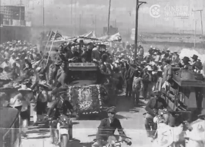 Lanzado de manera formal como candidato a la Presidencia por el Partido Nacional Revolucionario (PNR) el 6 de diciembre de 1933, Cárdenas llevó a cabo una serie de giras proselitistas, las más intensas y amplias de cuantas se conocieron hasta ese momento del periodo postrevolucionario. Puebla fue uno de los primeros estados que visitó, cosa que ya se enunciaba en los diarios desde el 19 de enero de 1934 (“Con ese motivo, el Comité Estatal del Partido Nacional de Puebla ha organizado una brillante recepción contando con todos los partidos, y organizaciones obreras y campesinas de filiación cardenista”, señalaba “El Universal”, por ejemplo). El corto (14 minutos de duración) catalogado como [Gira electoral de Lázaro Cárdenas en Puebla], ca. 1934, abre con una toma de acercamiento al candidato del ya para entonces partido oficial aún bajo el predominio de Plutarco Elías, el llamado “Jefe Máximo de la Revolución”, para desde ese referente icónico, mostrar una serie de escenas de masas convocadas por la presencia del candidato, quien a la postre, según cifras oficiales, obtendría ¡el 98.19%! de los votos emitidos varios meses después.