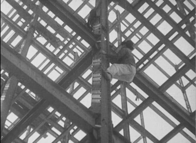 El corto expone la instalación de una obra magna en el ramo ingenieril y registra el trabajo rudo y peligroso al que se expusieron los trabajadores, como aquel albañil parecido a un equilibrista semejante a Harold Lloyd en “El hombre mosca” [1], quien cuelga de las manecillas de un edificio, sin caer al aire por su habilidad corporal en una escena de antología cómica. En el corto de nitrato, uno de los albañiles de la Torre Latinoamericana sube las estructuras metálicas confiando en la destreza de su físico, sin cuerda o andamio, como atenuantes a un eventual accidente drástico. Llama la atención también que los trabajadores no usen casco metálico sino simples sombreros.
