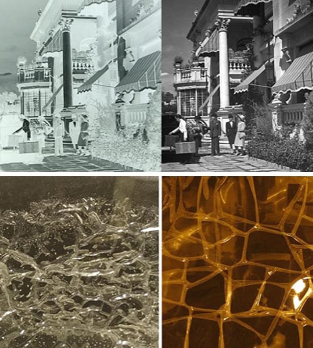 Foto 1 y 2. Detalle de still 8 x 10. Del lado izquierdo se observa la imagen del negativo y a la derecha la fotografía. Colección de negativos del acervo iconográfico, Cineteca Nacional. Foto 3 y 4. Detalle de deterioro en negativos de acetato de celulosa.