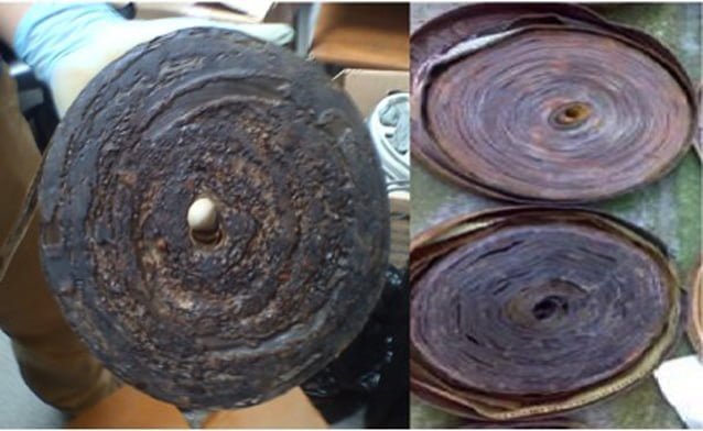 Película de nitrato de celulosa en etapa avanzada de degradación. Foto de registro de trabajo del Laboratorio de Restauración Digital de la Cineteca Nacional.