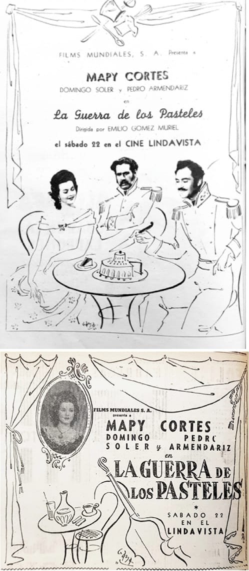 “El pintor Ramón Gaya contratado por Films Mundiales. Uno de los mejores pintores que ha venido a México en los últimos tiempos, ha sido contratado por Films Mundiales. Para principiar su trabajo para esa casa, le han encomendado los dibujos de los letreros de “La guerra de los pasteles” y, para tal efecto, “script” en mano, ha diseñado tres o cuatro cartones de gran belleza y que concuerdan perfectamente con el espíritu de la cinta. Pero seguramente Gaya principiará dentro de poco a hacer escenografía, ya que la decoración y la misma escenografía son parte de su profesión, después de la pintura”.