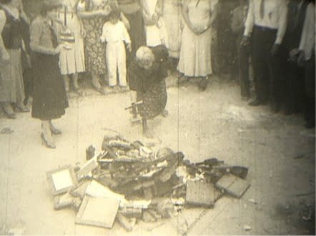 Un niño vierte combustible sobre la figura de un santo que destaca en una pira de objetos religiosos. Fotograma tomado de: [Destrucción de iglesia y quema de objetos religiosos]. Copia de acetato en 35 mm.