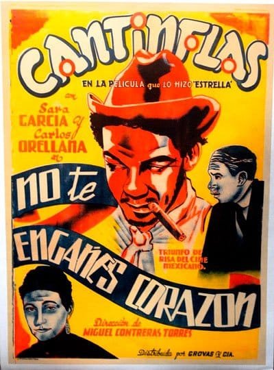 Se tomó muy a pecho su personaje. Estaba visceralmente aferrado a él, la capital entera atrapada sin remedio y precipitada a una fiebre cantinflesca. La situación hizo evidente que necesitaba entre manos asuntos más serios. Esto es, encontrar alguna vía de escape a la pesada rutina carpera. Solución lógica: incursionar en el cine para acrecentar su popularidad, tener más tiempo libre y, sobre todo, más dinero. Sin embargo, su desparpajo no era garantía de éxito inmediato como lo demostró su primera, “No te engañes corazón” (1936), del inefable director pionero Miguel Contreras Torres. Peliculita de pobre presupuesto que pretendió ser “la primera supercomedia del cine nacional que le hará reír a carcajadas y también llorar”, quedó corta en sus promesas. Simple y primitiva, muchos la han considerado la peor (y esto es ya decir) de las hasta entonces veinte dirigidas por ese naif supremo que fue Contreras Torres.