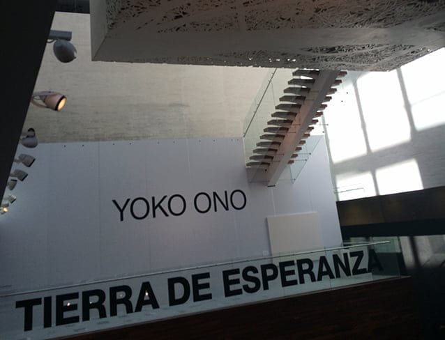 La exposición “Yoko Ono. Tierra de Esperanza” fue realizada ex profeso para la Ciudad de México, de acuerdo a la visión pacifista y el activismo de la viuda de John Lennon, e implica el fortalecimiento de su presencia en Latinoamérica. En ella, figuran obras emblemáticas de la artista como “Teléfono en el laberinto”, con un teléfono escondido dentro de un laberinto de acrílico, “Instrucciones” (Instructions”, 1953-2016), o “Pintura de techo” (Ceiling Paiting), la pieza que se dice propició el primer encuentro de Yoko Ono con Lennon. También se exhibe el filme “Cielo TV” (Sky TV, 1966-2016), que fue creada cuando Yoko vivía en una recámara sin ventanas y sin cielo que mirar.