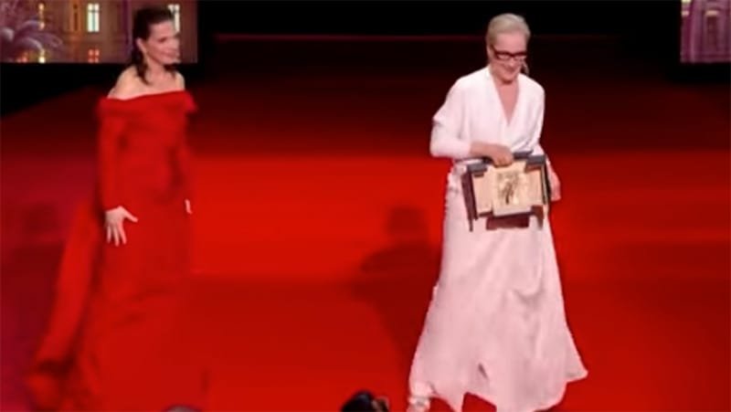 Luego vino la presentación del homenaje a Meryl Streep, a quien se le ofreció una Palma de Oro de honor por su obra magistral. Esta Palma de Oro fue entregada por la gran actriz francesa Juliette Binoche, quien, en un texto leído en inglés, hizo llorar al público y también a Meryl Streep. Juliette, muy emocionada, dijo: “Tu cara y tu voz son parte de nuestras vidas. Nos diste tantas emociones. Nos hiciste madurar. Cuando te veo en la pantalla, no eres tú quien veo, es todo un movimiento que pasa por ti. Y esto es ser un actor. Pero en realidad es mucho más que eso. Es un lienzo que crece con tu presencia y que deja venir la belleza en ti. Lo que te atraviesa en un instante es el deseo, el espíritu, la energía, el amor, la verdad. ¿De dónde te viene todo esto? ¿Naciste así? ¿Cuál fue tu sueño?”