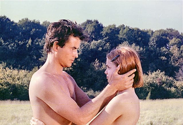 De nacionalidad inglesa, el piloto en cuyo avión iba, había calculado mal el sitio de aterrizaje, y así se había hecho la herida en el pie, por lo tanto, él es uno de esos que ella llama “terroristas”, y está decidido a encontrar al resto de sus compañeros. Cuando, por fin, él vuelve a caminar, ambos escapan al río donde nadan sin ropa, envueltos en lo que parece un idilio perfecto, que recuerda la inocencia primigenia que caracteriza a los personajes del hermoso filme griego “Jóvenes Afroditas” (Mikres Afrodites, 1963), de Nikos Koundouros: un amor de antes de Cristo, pleno y enmarcado en la naturaleza. Pero Claude apenas la toca –en el ático la ha besado en la mejilla, tomándola desprevenida, como en un arrebato, al verla tan hacendosa, preparándole un lecho- y es ella quien siempre revela sus intenciones, alegado que lo ama, y que desea casarse con él. No faltan los abrazos de una Nanette por completo desnuda, rodeando con sus brazos el torso desnudo de Claude, que unos segundos antes se ha puesto los pantalones.