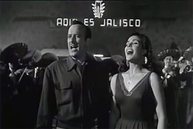 Si el Censo de Población de 1950 revelaba que Guadalajara ya contaba con alrededor de 380, 000 habitantes y que, por tanto, su condición de área provinciana estaba quedando atrás a ritmo acelerado, el cine mexicano de las dos décadas subsecuentes insistió en recurrir a la ya para entonces canción emblemática de esa ciudad en otros 15 títulos, sin que faltara una nueva versión interpretada por Tito Guízar para la descolorida cinta “Música en la noche” (Tito Davison, 1955) y sin que dejara de ser obligado fondo musical tanto de las comedias deportivas “Las chivas rayadas” y “Los fenómenos del futbol” (Manuel Muñoz, 1962) como de comedia juvenil “Guadalajara en verano” (Julio Bracho, 1964), producida por el jalisciense José Luis Bueno para enfatizar que la capital de su estado natal estaba a punto de alcanzar el millón de habitantes; es decir, en catorce años la población tapatía estaba próxima triplicarse. Y, como para completar ese concepto que ya integraba a las nuevas generaciones en plan celebratorio hasta la caricatura (el Movimiento Estudiantil-Popular del 68 todavía quedaba algo lejano), la película hollywoodense “Fun in Acapulco”, filmada por Richard Thorpe en 1963 y nunca estrenada formalmente en México (parece que pesó sobre ella una muy velada censura oficial) mostraba al ídolo del rock Elvis Presley cantando la popular melodía de Pepe Guízar con un español bastante “champurrado”, por decir lo menos, y en un contexto plagado de elementos folclóricos que sin duda podemos calificar, si se nos da la gana, de aberrantes.