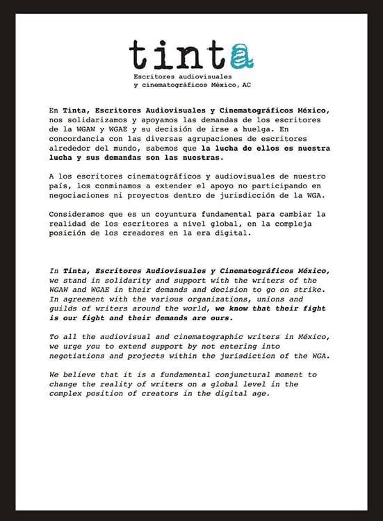 Redacción. Los escritores de la asociación “Tinta, Escritores Audiovisuales y Cinematográficos México” se han solidarizado con los escritores del sindicato Writers Guild of America (WGA) integrado por sus dos ramas principales, WGA-East y WGA-West, apoyando su decisión de ir a huelga en la industria del entretenimiento.