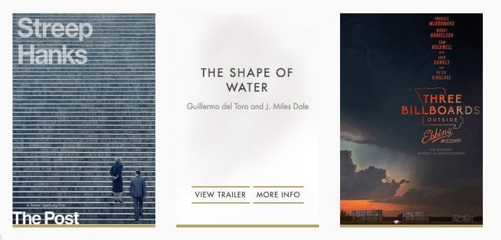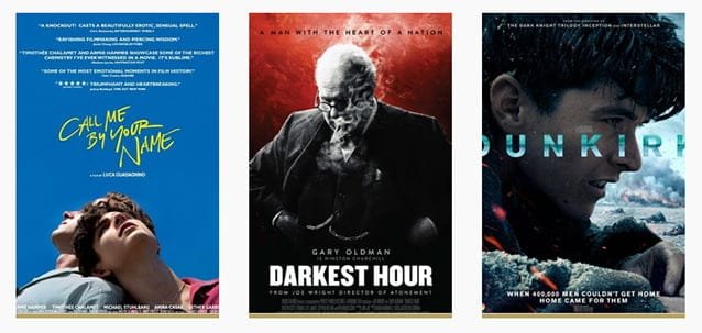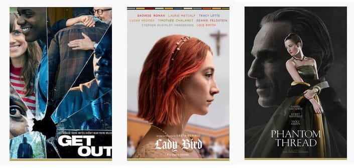 Nominados: Call Me by Your Name, The Darkest Hour, Dunkirk, Get Out, Lady Bird, Phantom Thread, The Post, The Shape of Water y Three Billboards Outside Ebbing, Missouri.