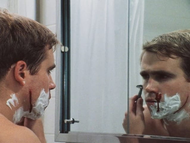 Entonces comienza. Primero es un corte a nivel del lóbulo de la oreja izquierda, y otro bajo la nariz. Luego, los cortes son más numerosos, y la sangre gotea al lavabo. El agua corre por el efecto de Coriolis: sangre y agua, como en la escena de la bañera de la célebre, referencial y reverenciada “Psicosis”, de Hitchcock, estrenada siete años antes.