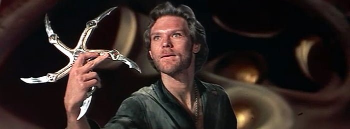 Así mismo, hay varias pruebas iniciáticas en su historia: la sustracción de la lava ardiente del “Glaive” (la “estrella de cinco dagas” que, una vez en manos de su poseedor, abre cada brazo, haciendo saltar una navaja retráctil, y que se arroja como un boomerang o una suerte de artefacto ninja), un arma poderosa, única capaz de destruir al enemigo, que emparenta con ese objeto numinoso que es el Anillo Único de Tolkien, que sólo se puede destruir en la lava del volcán el “Monte del destino”; el hermoso y, a la vez, aterrador intermedio que narra la historia de amor entre Ynyr (que debe salvar la distancia entre la entrada de la cueva y su amor de antaño, sorteando el destino de morir bajo los pedipalpos de una gigantesca araña blanca) y “La viuda de la telaraña” (Francesca Annis), poderosa vidente, a quien no podemos dejar de comparar con la vengativa Miss Havisham de la novela de Charles Dickens “Grandes esperanzas”, envejecida, marchita y maldita por haber asesinado a su hijo, por despecho, cual Medea, que sabe el próximo movimiento de la fortaleza negra (la mejor secuencia de toda la película), o la doma de las “yeguas de fuego”, capaces de recorrer mil leguas en un día, cuyos efectos especiales de “vuelo” resultan francamente risibles.