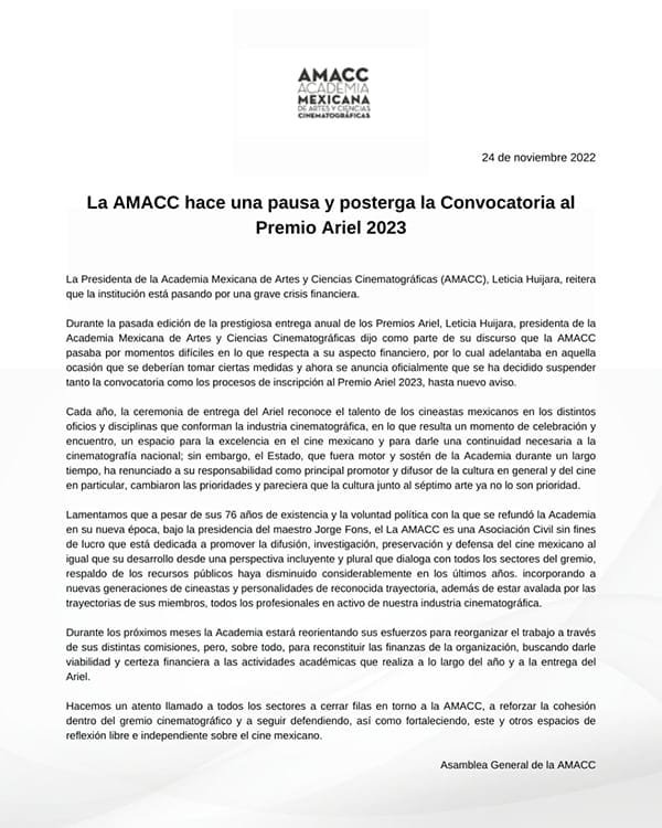 Durante la pasada edición de la prestigiosa entrega anual de los Premios Ariel a lo mejor del cine mexicano, Leticia Huijara, presidenta de la Academia, dijo como parte de su discurso que la AMACC pasaba por momentos difíciles en lo que respecta a su aspecto financiero, por lo cual adelantaba en aquella ocasión que se deberían tomar ciertas medidas y ahora se anuncia oficialmente que se ha decidido suspender tanto la convocatoria como los procesos de inscripción al Premio Ariel 2023, hasta nuevo aviso.