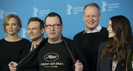 Hace casi dos meses publicábamos la información sobre la presencia de Lars von Trier en la Berlinale 2014 con el lanzamiento de la versión larga, editada por él mismo, de su “Nymphomaniac”, cuya versión más accesible se estrenó en diciembre, bajo el título de “La “venganza” de Lars von Trier: estrena la versión larga de “Nymphomaniac” en Berlín”. Si a alguien le podía caber alguna duda sobre que estaba mandando un mensaje revanchista a Cannes, festival que años atrás le consideró oficialmente “Persona non grata” por una rueda de prensa en la que ironizó sobre Hitler y los judios, se ha encargado de disiparla este domingo. Acudió a su cita con los periodistas vistiendo una camiseta con el logotipo del certamen de la Costa Azul, la Palma de Oro, y bajo éste la leyenda “Persona non grata, official Selection”. Algunos dirán que eso en castellano se llama provocación, aunque puede ser simplemente un capítulo más de la permanente campaña de marketing que ha establecido el danés desde que empezó a hablar de este díptico supuestamente porno sobre una mujer mercada por su adicción al sexo.