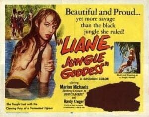 “Liane, Jungle Goddess” (Eduard von Borsody, 1956) es protagonizada por Marion Michael, quien encarna a esta «diosa de la jungla», actriz alemana de 16 años de edad, que pasa la mitad del filme en un controvertido topless que, en los segundos finales del mismo, se convierte un desnudo total (de lejos y de espaldas). Liane es uno de los tantos personajes que integran la lista de «diosas» de raza blanca y rubias entre tribus “primitivas” que tienen un lejano antecedente en “She”, secuela de la novela “Las minas del rey Salomón” de Henry Rider Haggard, pasando por la Ann Darrow original (Fay Wray) como la novia de “King Kong” en la cinta de 1933, es decir, un sueño húmedo masculino que descansa sobre los deseos eróticos de ver una mujer blanca, desnuda (o casi) entre «salvajes», ni más ni menos.