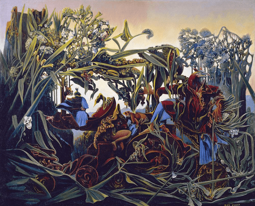 Entre los muchos recuerdos de su infancia también está el miedo recurrente y la fascinación que tenía por el bosque que rodeaba su casa, al que consideraba una especie de reino invisible, o mejor, una metáfora ideal de su subconsciente. Por tanto cabe destacar que, en la constelación de obras de Max Ernst, un elemento recurrente es la iconografía del bosque. La vegetación presenta metamorfosis insospechadas: hay anfibios que se transforman en aves…