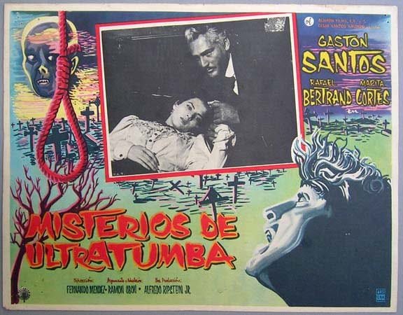 Si bien, las películas de Gastón Santos son “Weird Westerns” sólo en apariencia, mención aparte merece “Misterios de ultratumba” (1958) –distribuida en los Estados Unidos por K. Gordon Murray (III) primero, con el enigmático título de “Black Pit of Dr. M”, por United Producers Releasing Organization después, la mejor “Poverty Row”, encargada del mejor cine Serie B, por lo cual en dicho país ha sido justamente apreciada, y luego por la querida CasaNegra (IV)-, en la que tiene un papel secundario. Cinta dirigida por el hábil Fernando Méndez y, como todas, a excepción de “La edad de la tentación” (escrita por el director, Alejandro Galindo), basada en un guion de Ramón Obón, la única que, con su trama espiritista, su pacto del Más Allá, una pareja que se sueña mutuamente, el tema de la transmigración de las almas y una atmósfera sombría, merece su inclusión en el listado de películas que conforman lo mejor del “Gótico Mexicano” –que se remonta a la prestigiada cinta expresionista “Dos monjes”, de Juan Bustillo Oro, del año 1934, en la cual la carga religiosa recuerda los clásicos literarios del subgénero, como “El monje” (pub. 1796), de Mathew G. Lewis o “El italiano o El confesionario de los penitentes negros”, (pub. 1797), de Ann Radcliffe- en la que no falta el legado tenebroso –con su fuente inicial, e iniciática, “The Cat and the Canary”, dirigida por Paul Leni, en 1927-, una mujer enloquecida, y el hombre con el rostro carcomido por el ácido. “Misterios de ultratumba” –como tantos otros góticos mexicanos- acusa poca originalidad, pero su truculencia –igualmente recurrente en el fantástico mexicano- se debe más a una falta de pericia estética en la escritura del guion, que al cúmulo artificioso de hechos sobrenaturales que se remontan a “El castillo de Otranto” (pub. 1764), novela pionera del gótico, escrita por Horace Walpole.