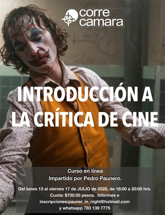 Objetivo: Adquirir las herramientas básicas para analizar una película. a).- Identificar las partes esenciales de una crítica cinematográfica. b).- Estructurar y escribir una crítica cinematográfica. Del lunes 13 al viernes 17 de JULIO de 2020, 18:00 a 20:00 hrs. Cuota: $700.00 pesos. 10% de descuento a parejas, grupos y personas que hayan tomado otros cursos de Correcamara Informes e inscripciones: pauner_in_night@hotmail.com y whatsapp 783 139 7775