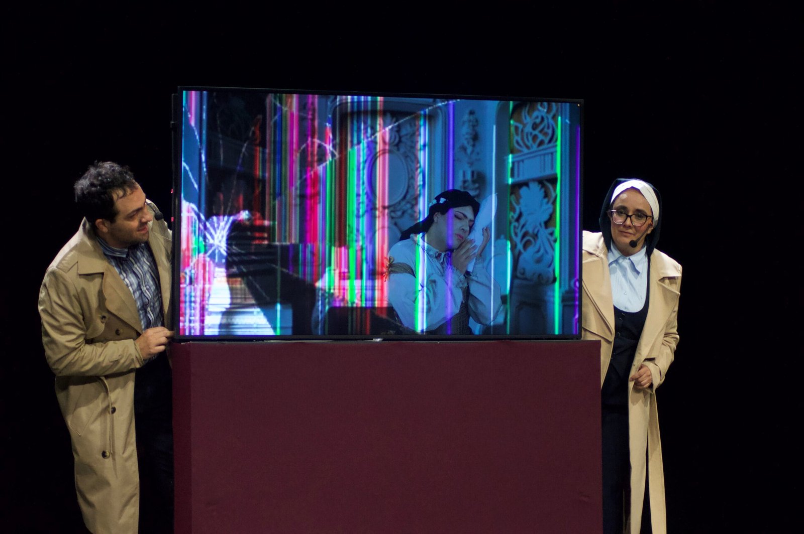 ¿Será esta una conferencia seria o una parodia llena de sorpresas? La sincronización entre los actores y los efectos audiovisuales resulta impresionante. Los momentos en los que los personajes “entran y salen” de las pantallas son un espectáculo en sí mismos, logrados con objetos sencillos y un diseño creativo que transforma cada escena en un viaje entre el drama y la comedia.