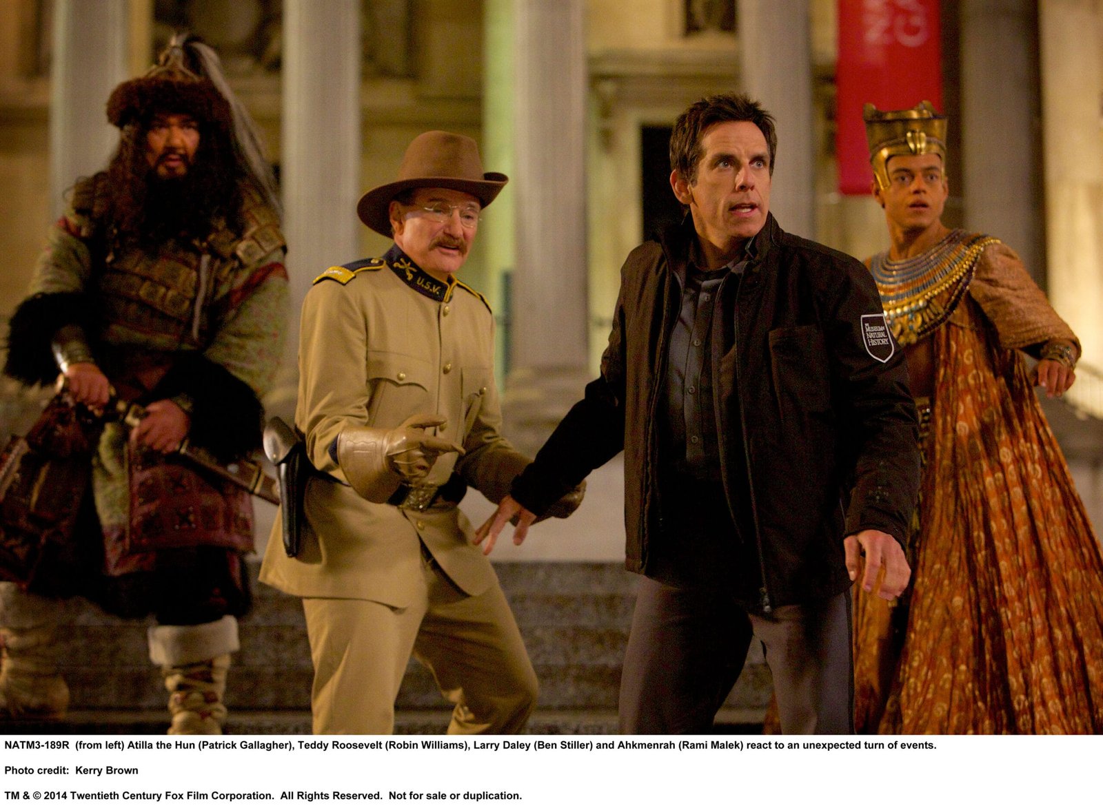Night at the Museum: Secret of the Tomb NATM3-189R (from left) Atilla the Hun (Patrick Gallagher), Teddy Roosevelt (Robin Williams), Larry Daley (Ben Stiller) and Ahkmenrah (Rami Malek) react to an unexpected turn of events. Photo credit: Kerry Brown TM and © 2014 Twentieth Century Fox Film Corporation.  All Rights Reserved.  Not for sale or duplication.