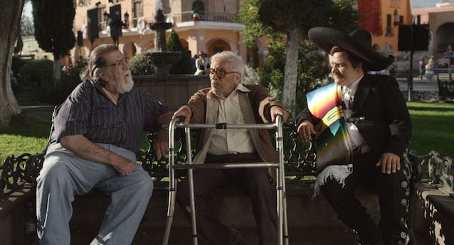 “En el último trago” (Jack Zagha, 2014) llega este fin de semana a la cartelera comercial mexicana. Ha pasado más de un año desde que se alzara con un premio del público en el FIC Guadalajara y varios meses desde que fuera presentada en el FIC Monterrey. Finalmente, vía un apoyo oficial de distribución, el segundo largometraje del director de “Adiós, mundo cruel” (2010) y del viral cortometraje “Yo también te quiero” (2005) intenta plantarle cara a las grandes producciones del periodo vacacional con una road movie sobre tres octogenarios devotos de José Alfredo Jiménez. Se trata de una comedia sencilla y liviana sobre un cuarteto de nostálgicos y jugadores de dominó que, al perder de súbito a uno de sus miembros, emprenden un viaje a Guanajuato para entregar a un museo regional la que consideran su posesión más preciada: la servilleta original en la que el charro de Dolores Hidalgo escribió los versos de “Yo”.