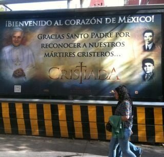 La publicidad donde aparece Benedicto XVI además muestra los retratos de los curas cristeros Anacleto González Flores y José Sánchez del Río. En el año 2000 el papa Juan Pablo II canonizó a 24 mártires de la persecución religiosa y a otros beatos también de México. En la guerra Cristera murieron cientos de personas, desde fieles hasta sacerdotes, todos ellos con el grito en la boca de ” Viva Cristo Rey y Viva la Virgen de Guadalupe”.